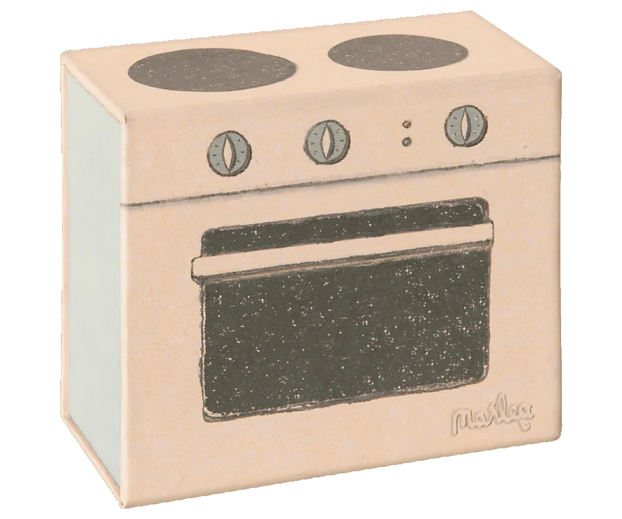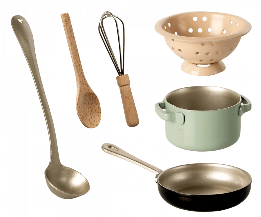 Maileg ihanat keittotarvikkeet liedenmuotoisessa säilytyslaatikossa! Sisältää paistinpannun, kattilan, siivilän sekä 3kpl välinettä,nämä metallia ja puuta
