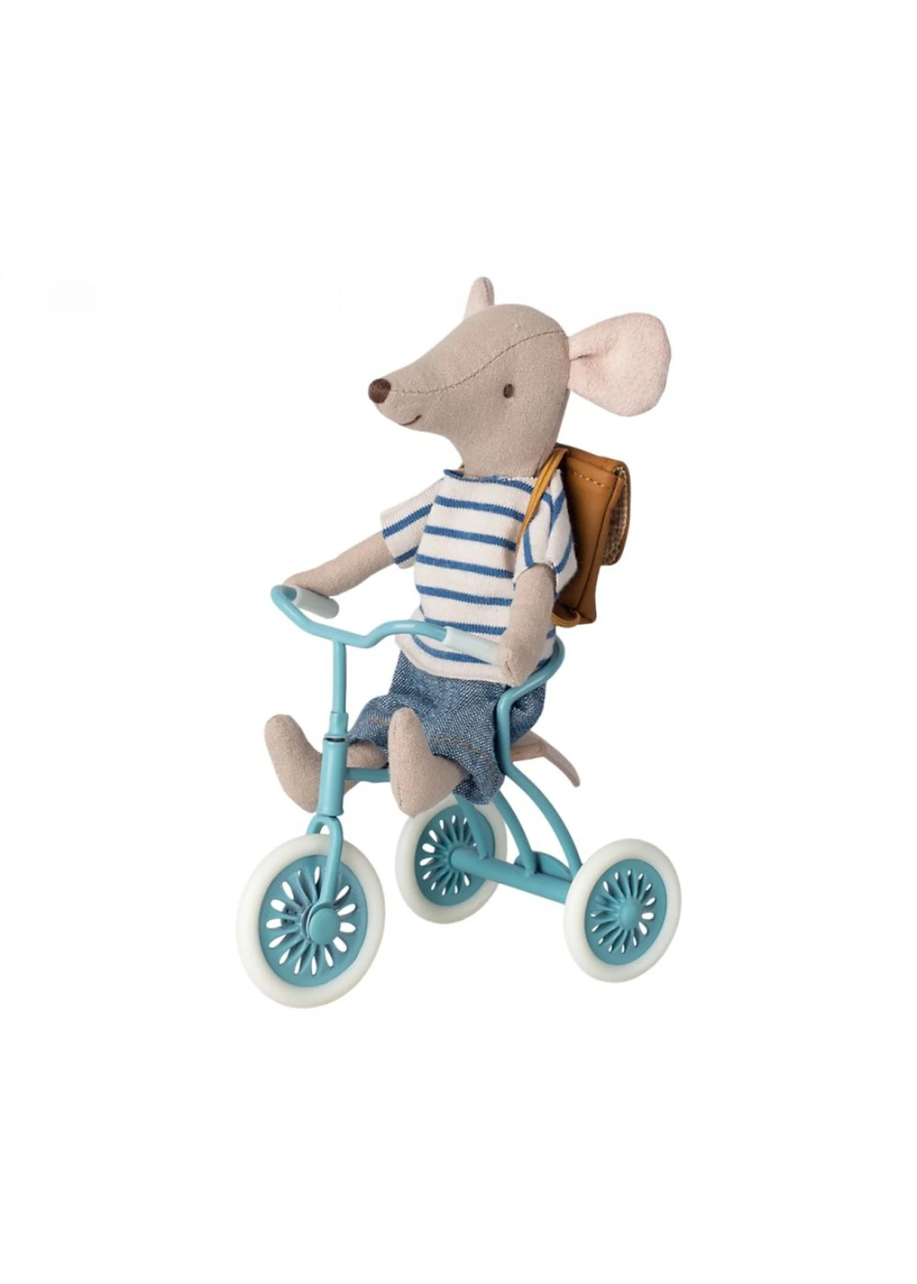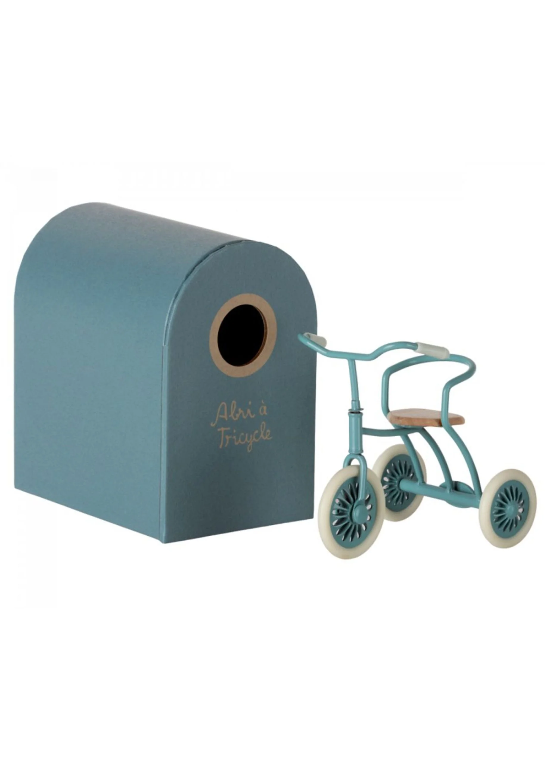 Maileg metallinen kolmipyörä tallilla, puinen istuin. Sopii hyvin pyöräilijä hiirille joilla käsissä magneetit! Ikäsuositus +3v