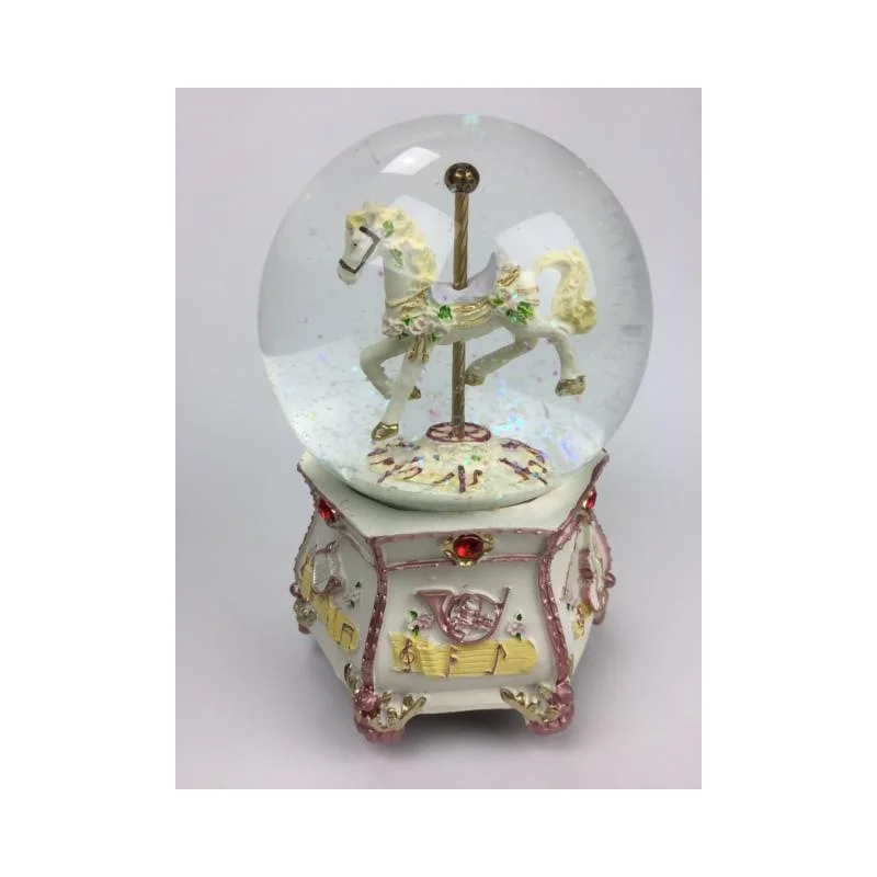 Ihana soiva glitterilumisadepallo sirkushevosella , väännettäessä soittaa sävelmää ”Amazing Grace”. Koko 10X15cm